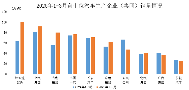 智通财经APP获悉,据中国汽车工业协会统计分析,2025年1-3月,汽车销量排名前十位的企业(集团)共销售630.2万辆,占汽车销售总量的84.4%。