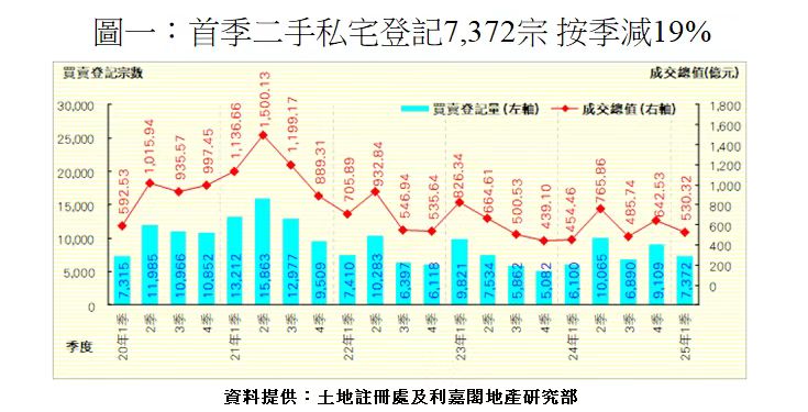 智通财经APP获悉,根据土地注册处最新数据,2025年第一季香港共录7,372宗二手私宅买卖登记,较去年第四季的9,109宗下跌19%,连续5季处于反覆波动的状态。成交总值方面,受累楼价偏软,第一季按季相应回落17%,录530.32亿港元,为连续5季表现波动。今年首季每宗平均售价719.37万港元,按季微升1.98%,但仍属2016年第四季以来的34季第3低。利嘉阁地产研究部主管陈海潮表示,放宽100港元印花税至楼价400万港元住宅,加上之前积聚的购买力趁楼价低水而持续释放,二手市场登记量预计在次季向好,有机会创下四个季度高位。