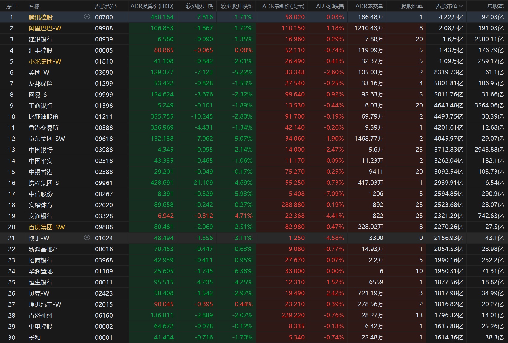 智通财经APP获悉,周一美股三大股指下跌,恒生指数ADR下跌,按比例计算,收报21064.91点,较香港收市下跌330.23点或1.54%。