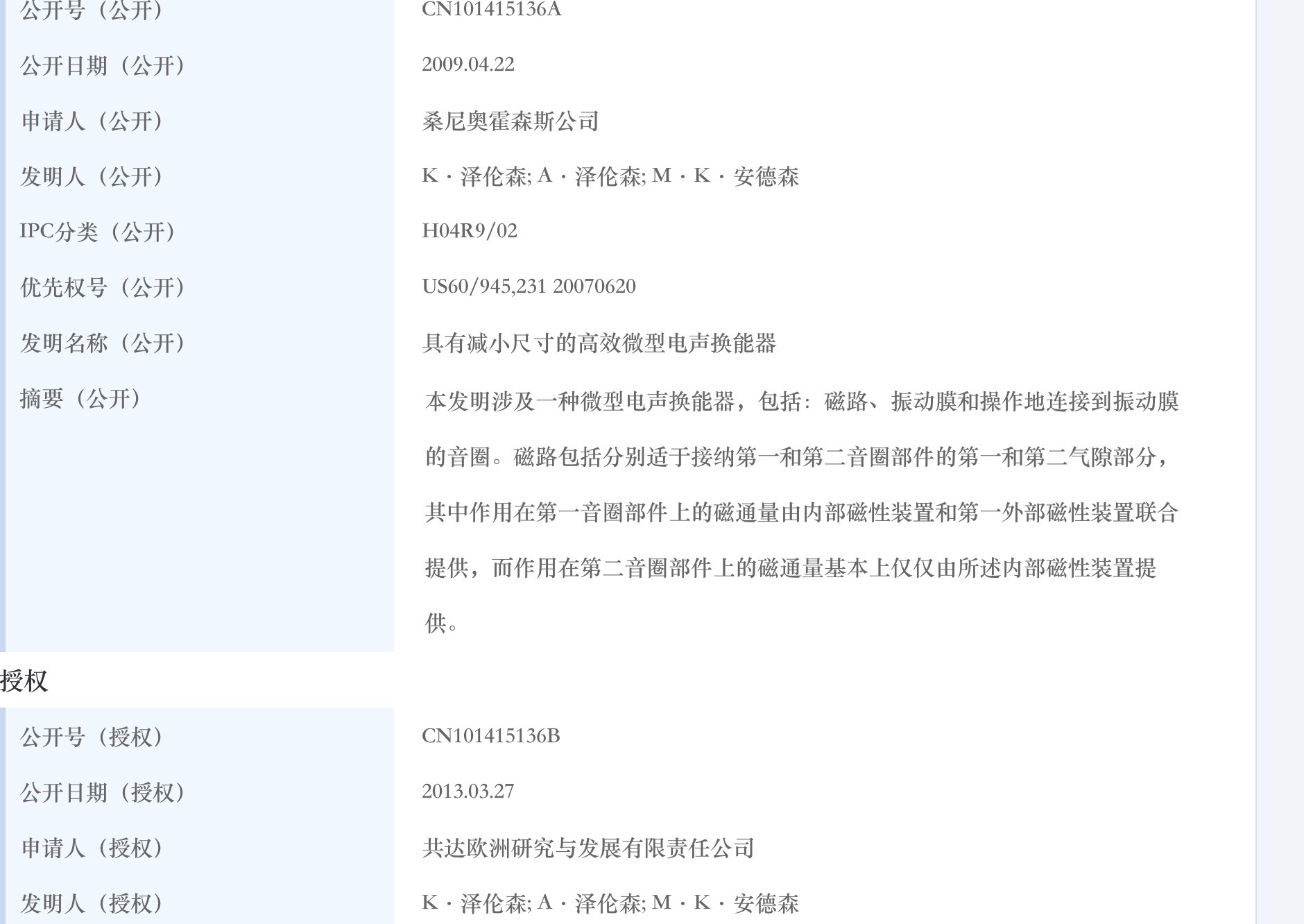 根据国家知识产权局信息,“具有减小尺寸的微型电声换能器”的发明专利最初由桑尼奥霍森斯公司申请,发明人为K·泽伦森、 A·泽伦森、M·K·安德森,首次公开于2009年4月;2013年3月,该发明专利权在经过了专利申请权、专利权的转移等操作后,发明专利权授予了共达欧洲研究与发展有限责任公司。根据共达电声招股书,共达欧洲研究与发展有限责任公司即GETTOP EUROPE R&D Aps ,为公司注册于丹麦的子公司。