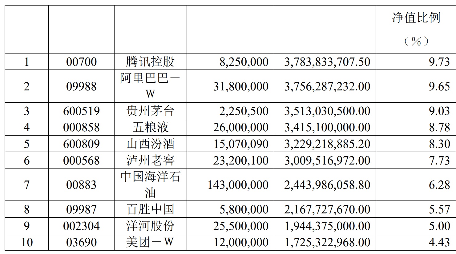 调仓方面,张坤代表作易方达蓝筹精选混合,前十大重仓股较去年四季度并未出现变动,依次为:腾讯控股(00700)、阿里巴巴-W(09988)、贵州茅台(600519.SH)、五粮液(000858.SZ)、山西汾酒(600809.SH)、泸州老窖(000568.SZ)、中国海洋石油(00883)、百胜中国(09987)、洋河股份(002304.SZ)、美团-W(03690)。