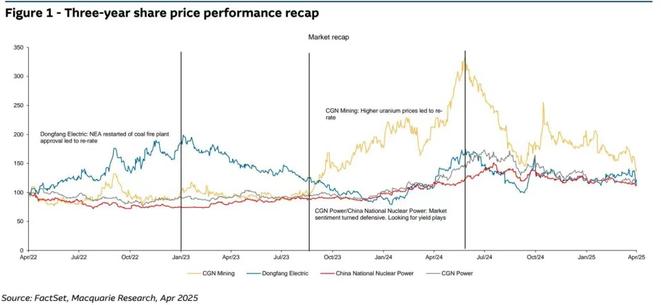 智通财经APP获悉,麦格理发布研报称,可再生能源的快速发展暴露了电网瓶颈。通过核能提升基荷电力、利用煤炭增强灵活性,对中国的能源转型至关重要。该行预计在可预见的未来,由于人工智能的普及和电气化进程,中国的电力需求增长将超过 GDP 增长。该行首次覆盖中国核能行业的四只股票:中国核能电力股份有限公司(买入评级,601985.SH)、东方电气股份有限公司(买入评级,600875.SH/01072)、中广核矿业有限公司(买入评级,01164)、中国广核电力股份有限公司(中性评级,003816.SZ)。