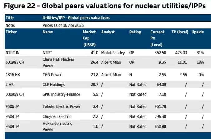 中国广核电力股份有限公司:该行预计中国广核电力的电价降幅将比同行更大,这是因为其在广东的业务占比较大,且在 2026 年与母公司重新签订铀供应合同时面临输入成本上升的压力。不过,新的产能增长将部分抵消这些利润率风险。