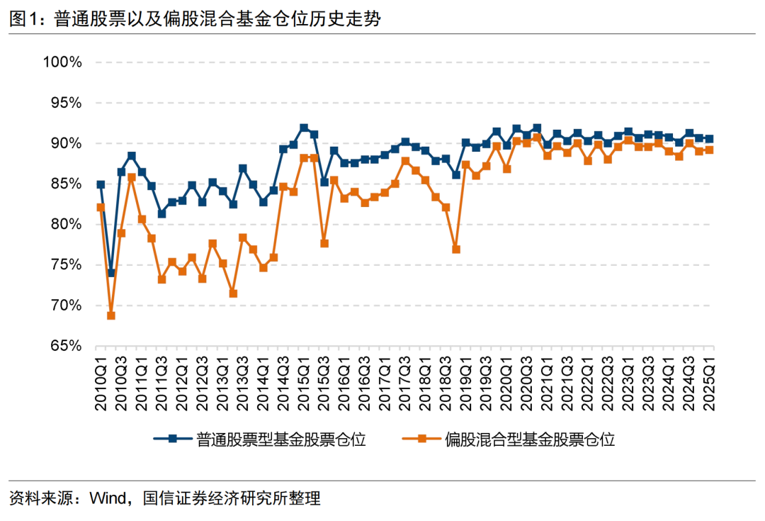 普通股票型基金仓位中位数为90.62%,偏股混合型基金仓位中位数为89.21%,与上一季度相比基本持平,自2020年以来持续围绕在90%仓位震荡。普通股票型基金仓位处在历史72.13%分位点,偏股混合型基金仓位处在历史78.69%分位点。