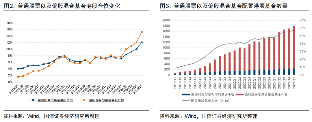 普通股票及偏股基金中配置港股的基金数量占比相较2024年四季度有所提升,整体来看配置港股的基金数量自2019年以来稳步提升。