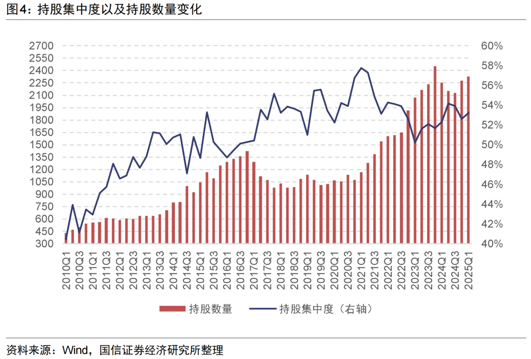 从图4可以看出,基金重仓股占权益配置比重为53.21%,上一期为52.61%,有所提升;另一方面,基金持股数量在2025年一季度相较于上一季度略有增加,基金经理总体持股数量为2331只,这意味着,基金经理持仓的股票差异化有所提升。