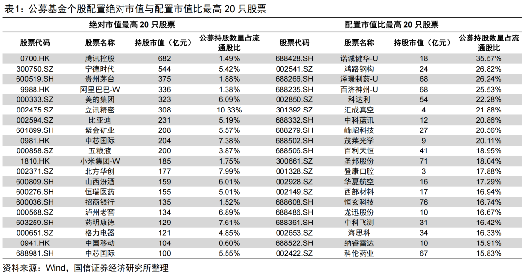 前文从板块以及行业的维度进行统计,这里我们将维度细化到基金持仓中的个股进行展开。通过统计基金经理对于个股配置的信息,可以看到基金经理的持股偏好以及持股变化。这里展示了本报告期主动权益基金个股配置绝对市值以及配置市值占流通市值比(简称配置市值比)这两个维度最高的前20只股票。对于参与计算的股票剔除上市不足9个月的新股。其中,个股配置绝对市值为主动权益基金配置个股市值的权重和。配置市值比为公募持股数量占该股票的流通股本的比例。