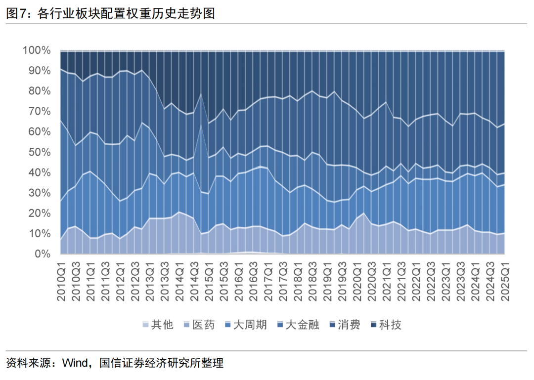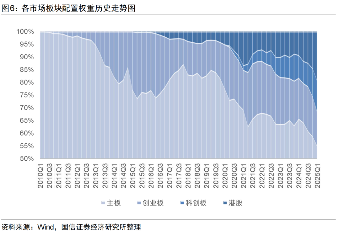 从市场板块配置的整体趋势来看,尽管主板与中小企业板进行了合并,主板配置权重仍处于历史低位。主板和创业板权重较上一季度明显降低,科创板和港股配置占比明显提升。其中,2025年一季报中披露的主板配置权重为55.08%、创业板配置权重为13.52%、科创板配置权重为12.27%,港股配置权重为19.12%。