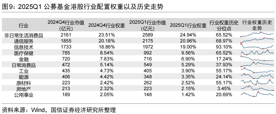 我们对公募基金在港股的行业配置情况进行了统计和展示。其中,持仓中行业分类标准为GICS行业分类。
