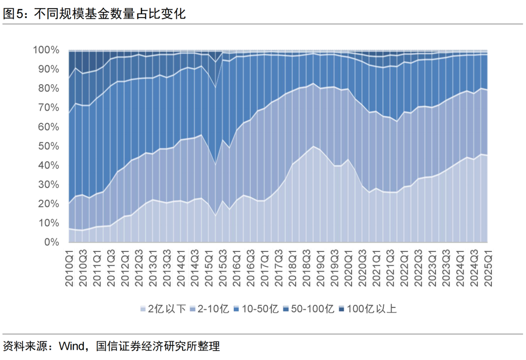 主动权益基金的规模变化一直是市场投资者所关注的方面,图5统计了过去十年间不同规模下基金数量占比,其中,我们划分为2亿以下、2-10亿、10-50亿、50-100亿以及100亿以上这5档进行统计。