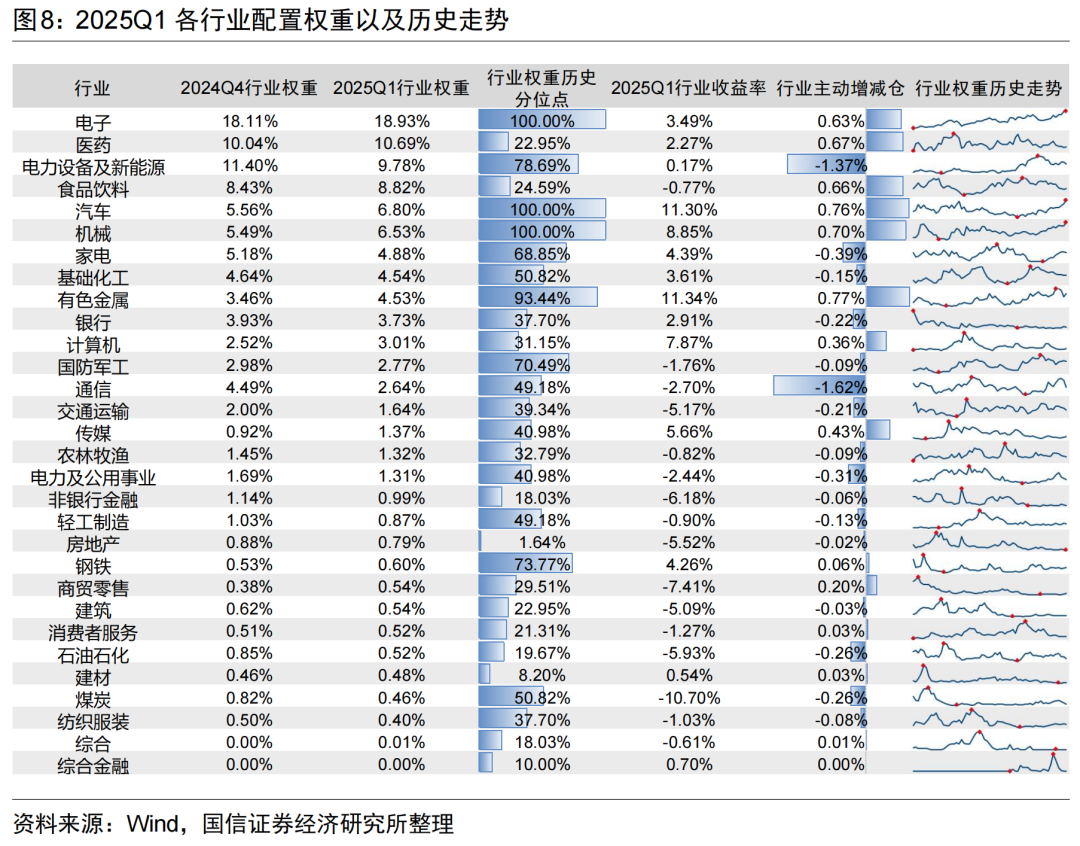 在2025年一季报披露的持仓中,主动加仓最多的三个行业为有色金属、汽车、机械,分别加仓了0.77%、0.76%以及0.7%,与此同时通信、电力设备及新能源、家电行业主动减仓最多,分别减仓了1.62%、1.37%以及0.39%。