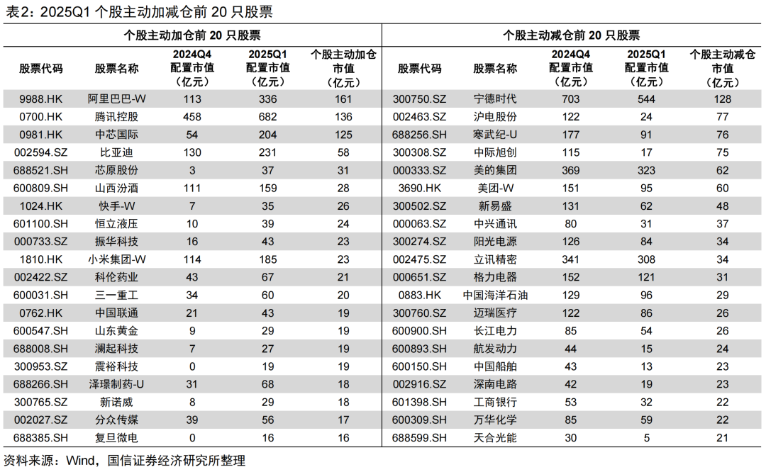 基金经理在个股上面主动加仓最多的三只股票分别为阿里巴巴-W(09988)、腾讯控股(00700)、中芯国际(00981),而主动减仓最多的三只股票则为宁德时代(300750.SZ)、沪电股份(002463.SZ)、寒武纪-U(688256.SH)。