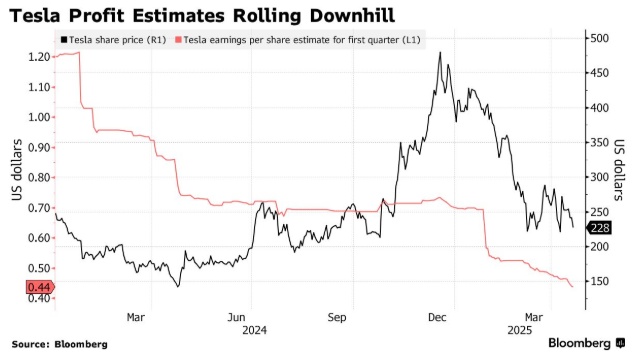 特斯拉2025年开局惨淡,马斯克的政治纠葛导致特斯拉前三个月销量跌至近三年低点,导致众多华尔街分析师大幅下调增长预期。这家汽车制造商黯淡的前景和高昂的估值令投资者感到恐慌,导致特斯拉股价自去年12月创下历史新高以来已暴跌53%。