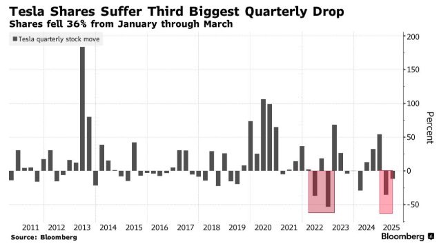 特斯拉股价今年暴跌,市场担忧马斯克的政治活动对公司品牌和销量造成的损害,同时加剧了投资者对经济增长和美国贸易政策的广泛焦虑。1月至3月期间股价下跌36%,这是该公司自2010年上市以来第三大季度跌幅。
