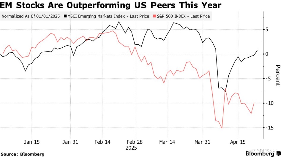 由于美国股市今年以来仍下跌10%,新兴市场股市的韧性显得尤为突出。这种分化表明,在特朗普政府反复无常的关税和其他政策损害了美国经济前景后,“卖出美国”交易获得了关注。在多年看涨美国股市后,基金经理们正在适应新的市场常态。