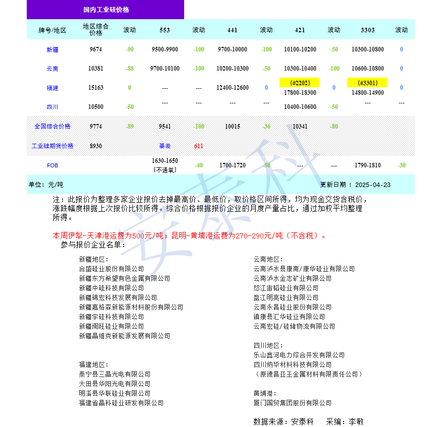 智通财经APP获悉,4月23日,硅业分会发文称,本周工业硅现货价格下跌。过去一周(2025年4月17日-23日),主力合约收盘价从9015元/吨一路下跌至8930元/吨,跌幅为0.94%。全国综合价格为9774元/吨,下跌89元/吨,其中分牌号来看,553为9541元/吨、441为10015元/吨、421为10341元/吨,分别下跌100元/吨、36元/吨和80元/吨,新疆、云南、福建和四川的综合价格为9674元/吨、10381元/吨、15163元/吨和10500元/吨。FOB价格下跌30-50美元/吨。