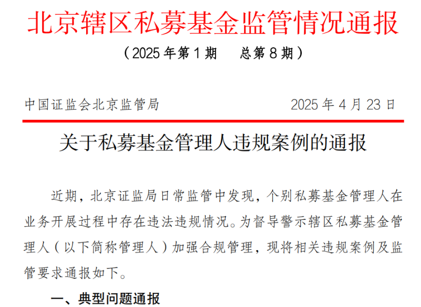 自2024年私募新规落地以来,私募行业便处于强监管状态。今日,北京证监局在最新发布的《北京辖区私募基金监管情况通报》中,也着重点名了辖区私募在产品募、投、管、退等环节遇到的典型问题。