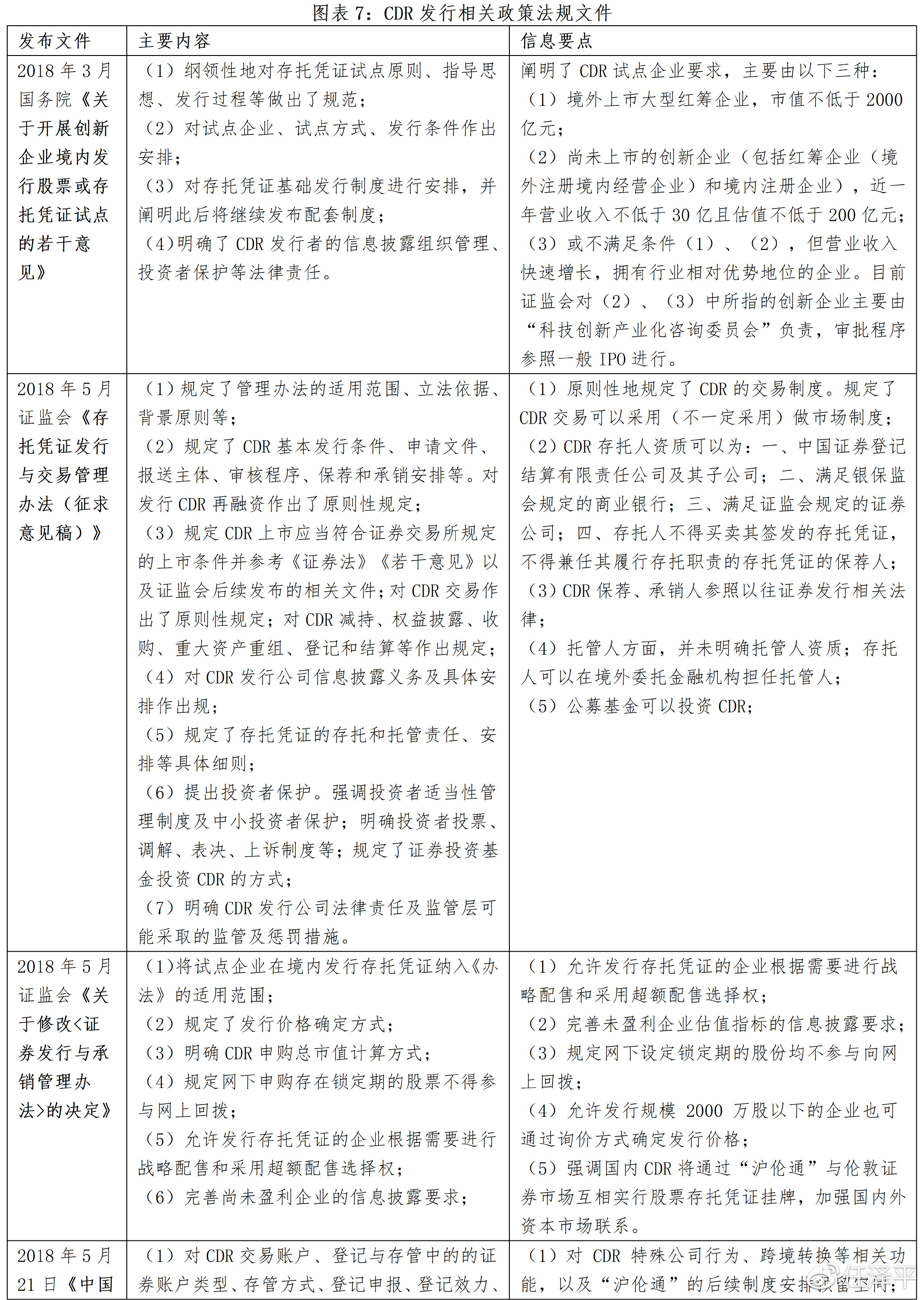 1)各方密集发声,政策预期升温。国务院、证监会、交易所、市场人士齐发声,短短3月间,来自证监会、沪深交易所、市场媒体、学界的权威声音纷纷表示CDR将很快推出,助力“独角兽”企业回归A股,营造较强市场预期。2)以成功案例促进政策落地。三六零、鸿特精密、宁德时代、富士康等“独角兽”巨头采取实际行动以借壳回归、独立上市等方式达到了了“注册制”效果,为即将以CDR方式回归A股的独角兽们开路试水。3)配套规则落地明显加快。2018年3月30日,国务院办公厅转发证监会《关于开展创新企业境内发行股票或存托凭证试点的若干意见》(国办发〔2018〕21号),一是明确境外注册的红筹企业可以在境内发行股票;二是推出存托凭证这一新的证券品种;三是进一步优化证券发行条件,解决部分创新企业可能存在尚未盈利或未弥补亏损的情形;四是充分考虑部分创新企业存在VIE架构、投票权差异等特殊的公司治理问题。证监会相应修改《首发管理办法》第二十六条和《创业板首发管理办法》第十一条,规定符合条件的创新企业不再适用有关盈利及不存在未弥补亏损的发行条件。