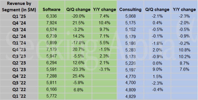 软件业务仍是IBM增长最快的部门,第一季度该部门销售额增长了7%,达到63亿美元。第一季度咨询部门销售额下降2%,至51亿美元。这些指标均符合市场预期。