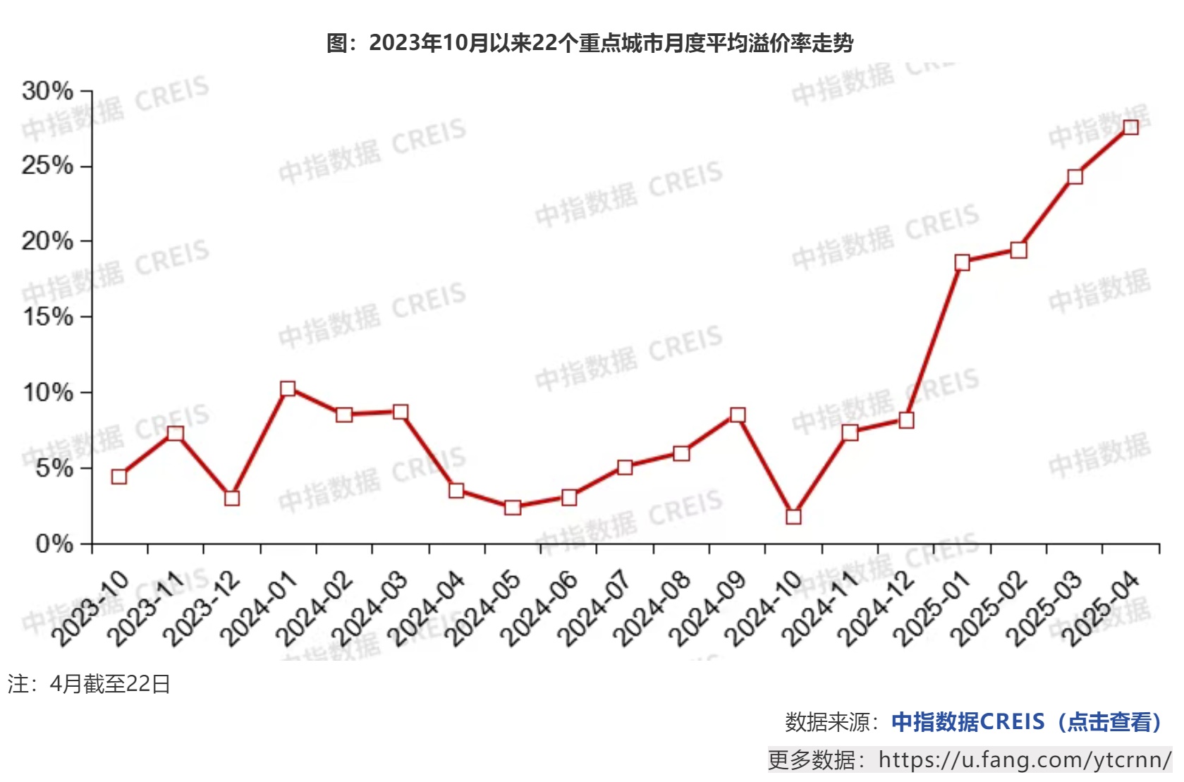 自2023年10月起,多地相继取消地价上限要求,加上房企投资持续聚焦,至去年底,22个重点城市宅地成交平均溢价率保持在5%-10%左右,市场整体表现较为稳定。随着去年四季度核心城市销售端逐渐好转,2025年以来,土地市场平均溢价率上升明显,根据中指数据,1-4月22个重点城市月度平均溢价率均在20%左右。同时,在核心城市土拍带动下,土地出让金同比增长显著,今年截至4月22日,300城住宅用地出让金同比增长20.1%。