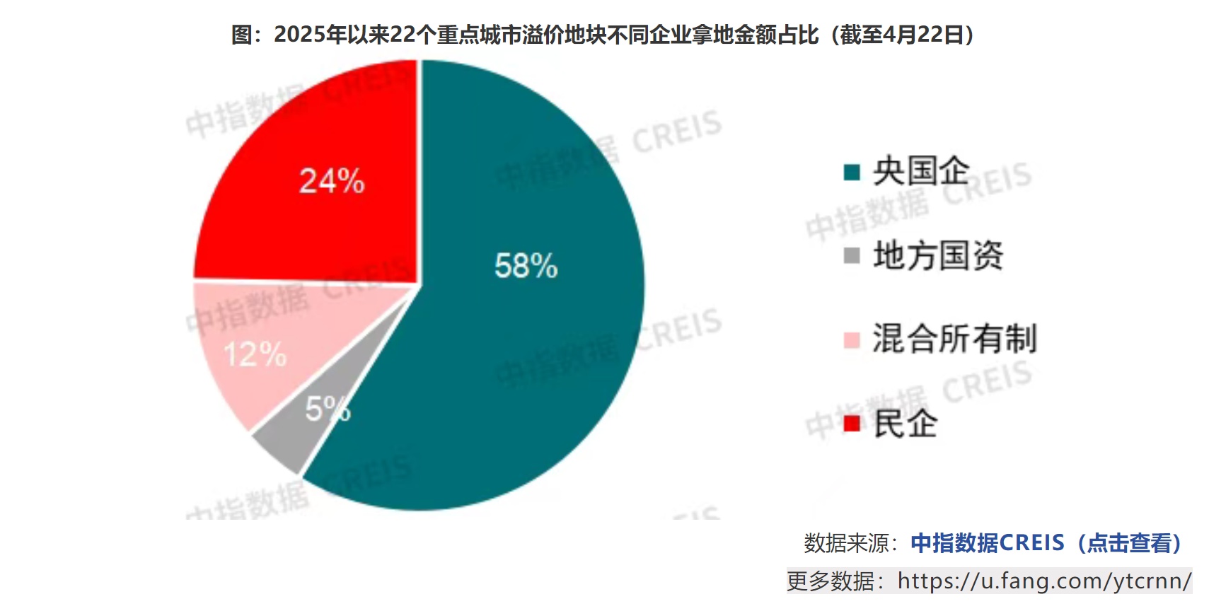 从拿地房企来看,头部央国企展现出更强的投资主动性和补仓能力。根据中指数据,2025年截至4月22日,22个重点城市溢价成交(溢价率>0)宅地中,央国企拿地金额占比达58%,民企拿地金额占比升至24%,主要是滨江一季度补仓力度较大,带动民企整体拿地占比提升。高溢价率地块来看,22个重点城市宅地溢价率在70%以上的地块中,央国企的占比达70%。