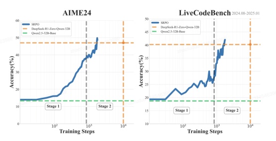 图:SRPO AIME24 和 LiveCodeBench 表现,每项为 pass@1 的32 次平均得分