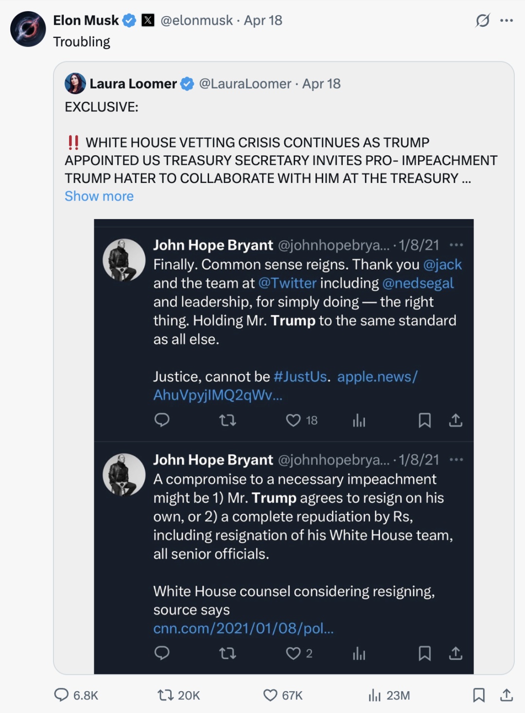 上周两个人的矛盾激化,一条X的帖子指责贝森特与“特朗普仇恨者”勾结。马斯克在转发时写道:“令人不安”。马斯克还取关了贝森特的账号。