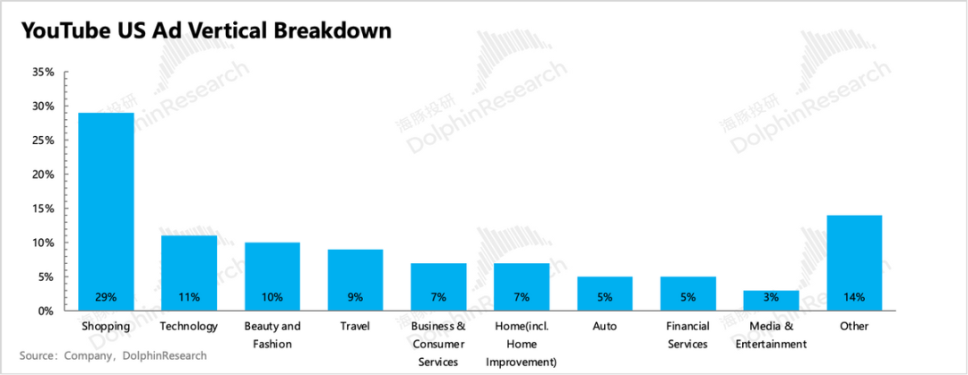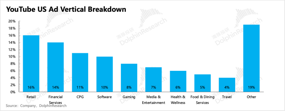 从不同广告主的收入贡献来看,YouTube中的零售、金融服务、快消品占比为最高的三项,这三项都是贸易战中影响不低的类别。