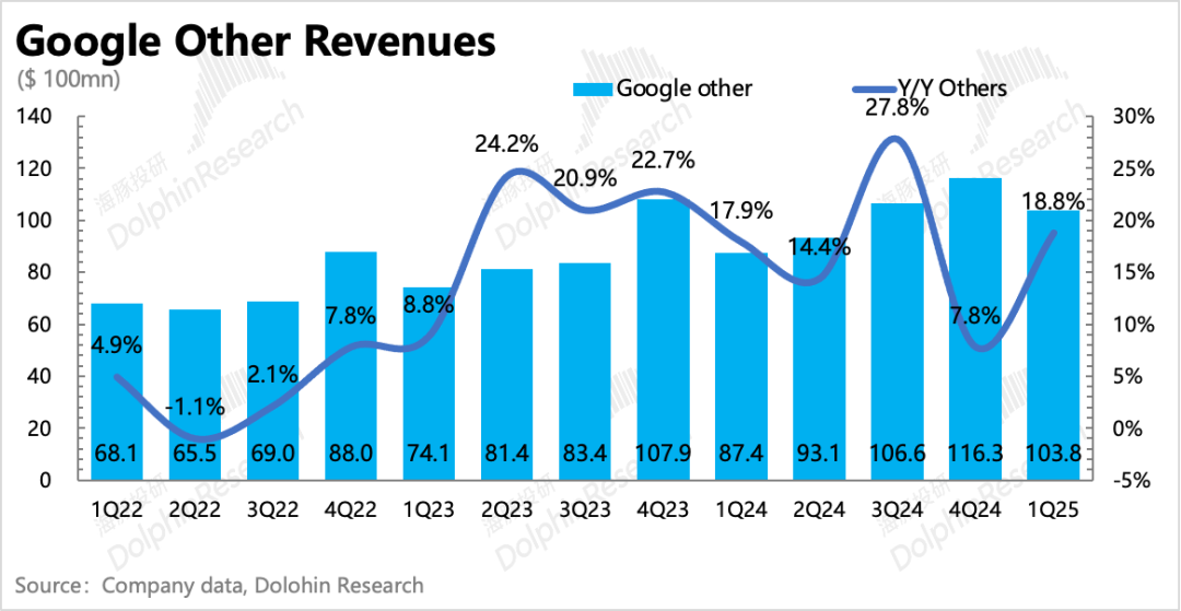 其次,YouTube订阅、Google Play以及Pixel系列的硬件等其他收入走过Pixel 系列销售周期错位带来的扰动,增速反弹,其中YouTube和Google one的订阅收入增长贡献了主要动力。
