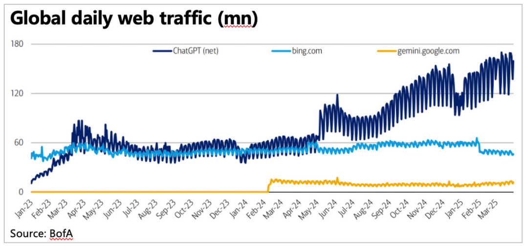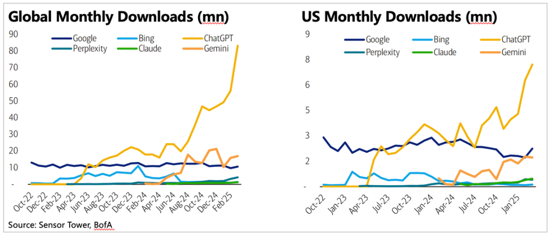 至于Alpha层面,去年推出的AI Overview,对用户搜索活跃度的提升有很大帮助,一定程度上巩固了谷歌搜索王国,从日活规模来看,去年以来增长持续提高。但中长期视角,随着AI发展速度不断刷新我们的预期,AI平台对传统搜索入口的流量争夺很难遏制住。今年年初以来,随着ChatGPT宣布开放搜索功能,免注册可使用OpenAI 3-mini等基础推理模型,ChatGPT流量加速奔跑,下载爆棚。