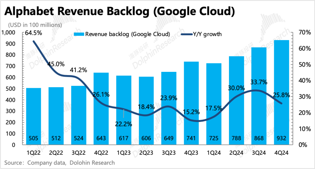 因此海豚君一般还是会通过谷歌的Revenue Backlog指标来判断短期趋势。这个指标中大部分是来自云业务,因此它的变化趋势也可以视作云业务的未履约合同量的变化趋势。