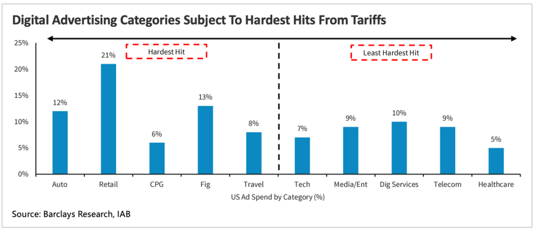 贸易战中,除了直接受影响的进出口链外,广告影响最大。不仅仅是因为美国零售快消过多依赖进口,还包括国家对抗下地缘风险上升,旅游、金融等服务消费同样会受到影响。营销活动的支出往往是公司最先“降本增效”的类目,因此广告影响自然首当其冲。