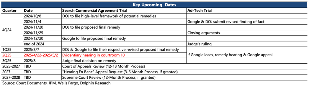 最后,近期正在开展关于谷歌反垄断诉讼案(移动设备默认搜索引擎、广告技术不公平竞争)的听证会。关于反垄断案的讨论,可以回溯海豚君在3Q24财报点评中的详细讨论。