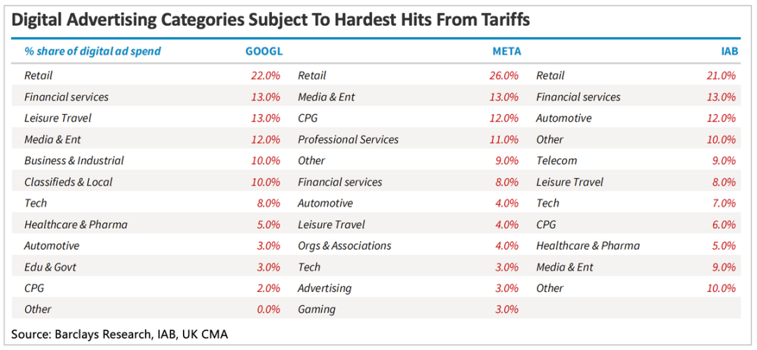 从整体广告的分类来看,谷歌的广告主除了零售与贸易战进出口直接相关外,TOP5都是服务消费居多,比如金融、旅游、媒体娱乐。这在关税战不持续升级到地缘对抗时,能相对硬抗。但如果升级到国家对抗阶段,那么影响也是不小的。