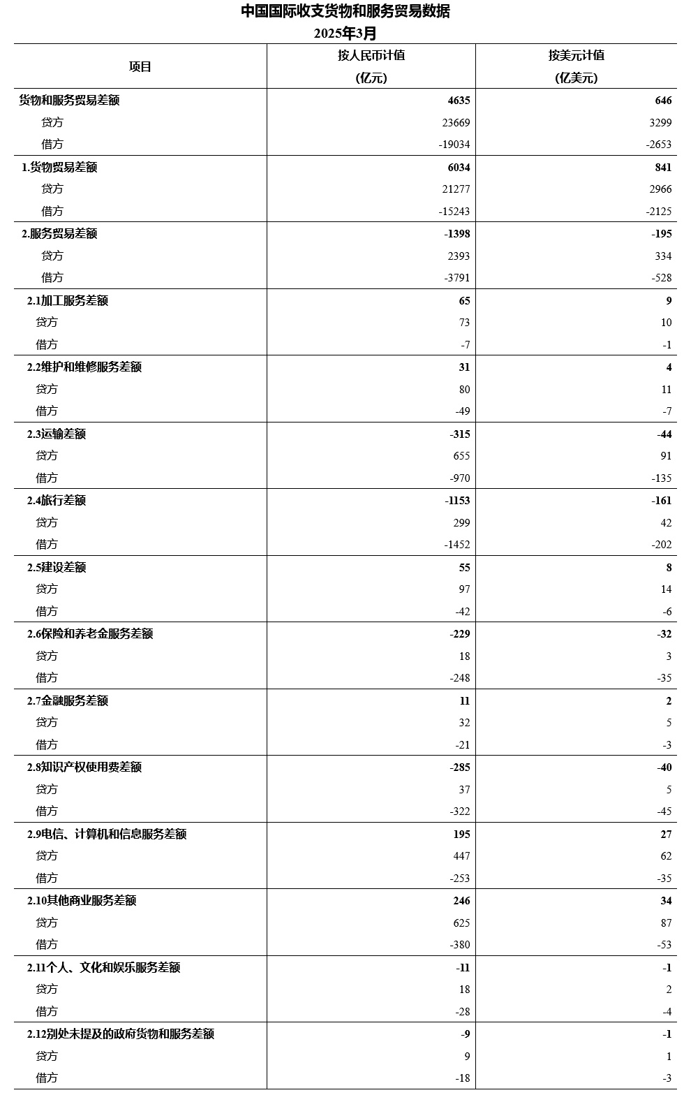 服务贸易主要项目为:旅行服务进出口规模1751亿元,运输服务进出口规模1626亿元,其他商业服务进出口规模1005亿元,电信、计算机和信息服务进出口规模700亿元。按美元计值,2025年3月,我国国际收支货物和服务贸易出口3299亿美元,进口2653亿美元,顺差646亿美元。