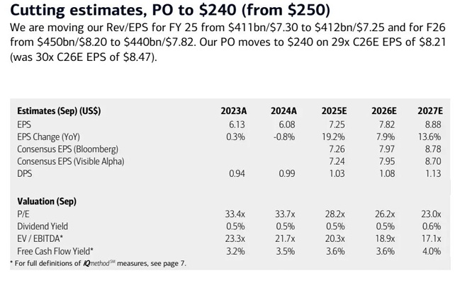 财年预期方面,美银将苹果2025财年(FY25)的营收/每股收益预测从4,110亿美元/7.30美元调整至4,120亿美元/7.25美元,将2026财年(F26)的预测从4,500亿美元/8.20美元下调至4,400亿美元/7.82美元。美银的最新目标价据此调整至240美元,相当于2026年预期每股收益8.21美元,基于29x预期市盈率(此前目标价基于30x预期市盈率以及2026年预期EPS-8.47美元)。