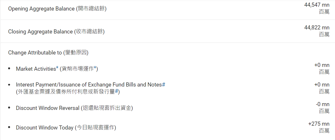 香港金管局通过贴现窗口向银行提供2.75亿港元拆借资金
