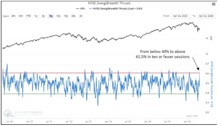 本周,美股受到总统特朗普表态的提振。他表示对华关税将从现有高达145%的水平下调,并表示无意解雇美联储主席鲍威尔,市场随即强劲反弹。更令人振奋的是,这一轮上涨覆盖面极广,几乎所有板块股票均参与上涨,触发了茨威格广度推力指标。