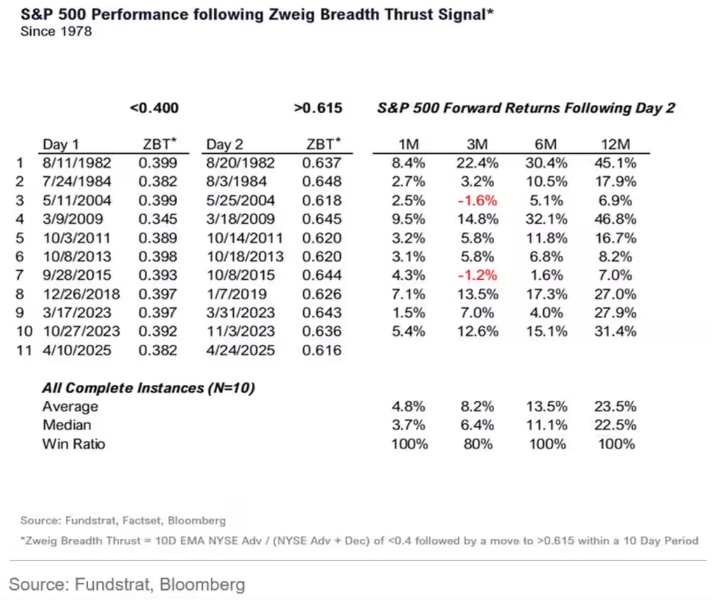 历史数据显示,这种信号极为罕见,但命中率颇高。数据显示,自1982年以来,标普500指数在出现茨威格推力信号后12个月内均录得上涨,10次中100%上涨,其中最大涨幅可达两位数。