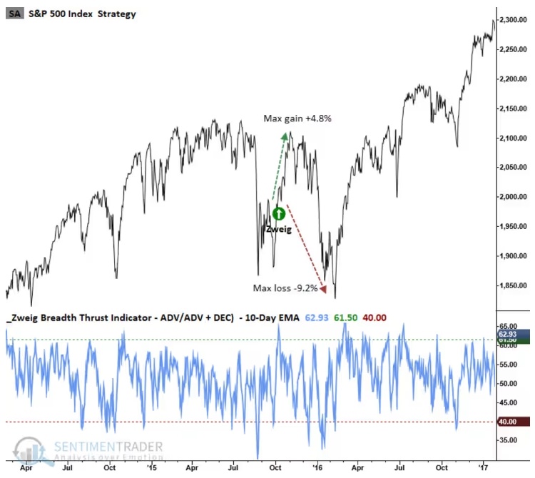 据SentimenTrader的高级分析师Dean Christians介绍,该指标通过计算纽约证券交易所中上涨股票占上涨+下跌股票总数的比例,并以10日指数移动平均线(EMA)平滑处理。当该比例从低于40%跃升至高于61.5%,并且在10个交易日内完成,就会触发买入信号。