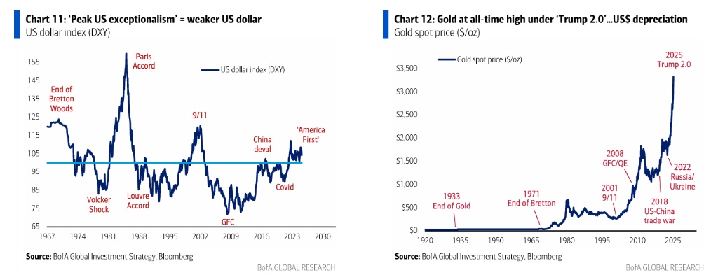 市场正从"美国例外论"转向"美国否定",美银全球策略师Michael Hartnett建议投资者逢高卖出美股,逢低买入国际股票与黄金。