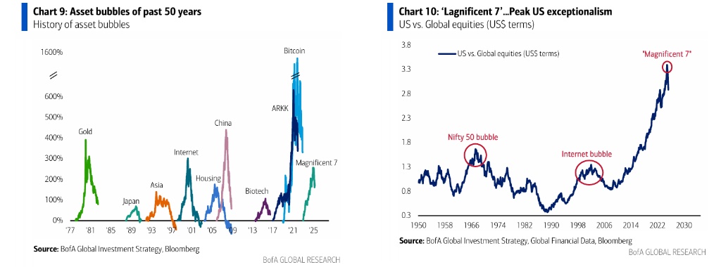 Hartnett认为,这一变化标志着"我们从未如此繁荣"的时代——低利率、超30万亿美元全球政策刺激、9%的美国政府赤字和AI繁荣——正走向尾声。