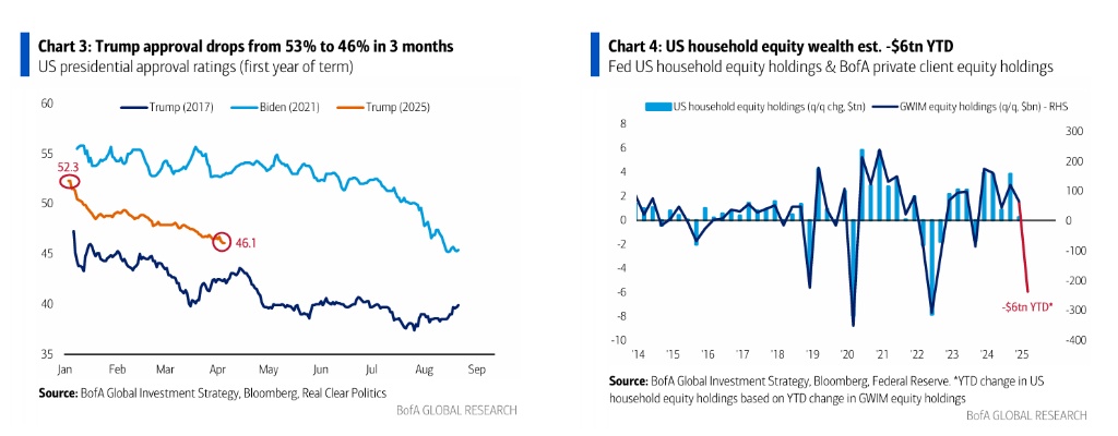 随着全球经济的再平衡,资金从美国市场流向其他地区,尤其是新兴市场和欧洲。这种资金流动趋势对黄金价格形成支撑。今年以来,黄金表现最佳(+26.2%),政府债券(+5.6%)和投资级债券(+3.9%)紧随其后,而美股下跌3.3%。而美国家庭股票财富今年已缩水约6万亿美元。