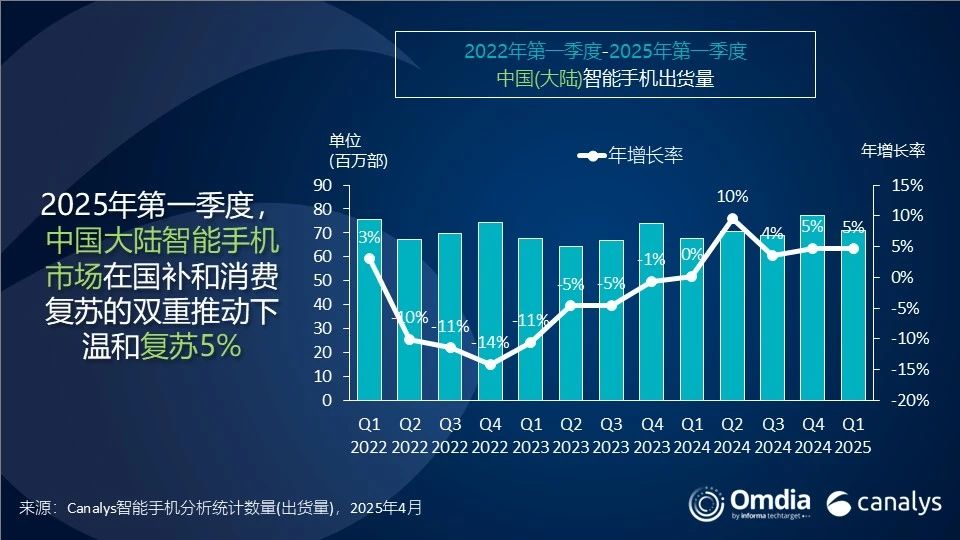 智通财经APP获悉,Canalys数据显示,2025年第一季度,中国智能手机市场出货量达7090万部,受到国家补贴政策提振及消费复苏推动,同比温和增长5%,延续了自2024年开启的复苏趋势。其中,小米(01810)出货量达1330万部,同比增长40%,在国补刺激以及其人车家一体的战略协同下时隔十年重回第一,市场份额19%。华为紧随其后,依旧维持双位数增长,出货1300万部,位列第二。OPPO、vivo分别以1060万部和1040万部的出货量位列第三和第四。苹果(AAPL.US)在其传统旺季后出现下滑,出货920万部,同比下跌8%,排名第五。