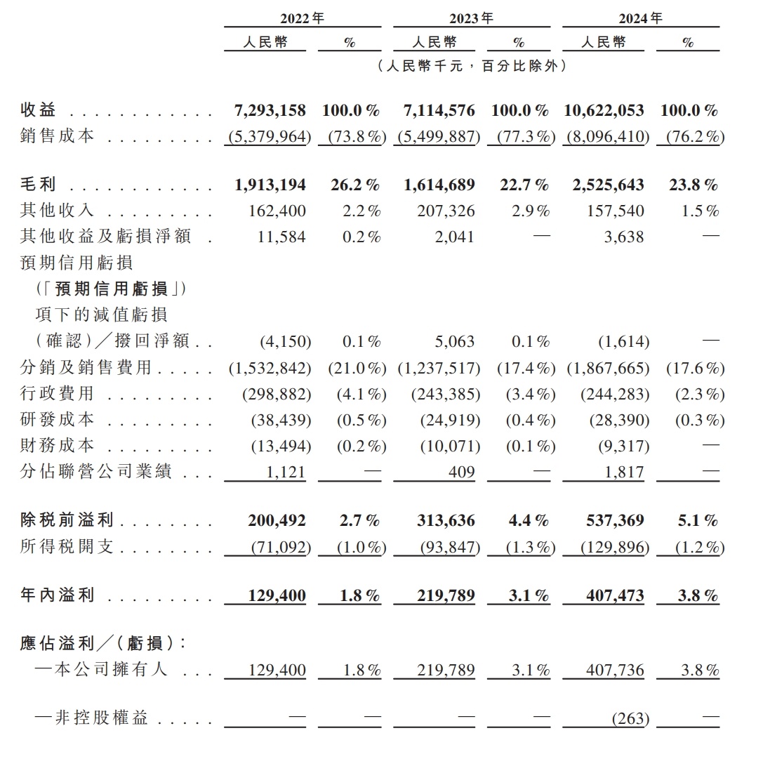 财务方面,于2022年度、2023年度、2024年度,三只松鼠收入分别约为72.93亿元、71.15亿元、106.22亿元人民币;同期,年内收益分别约为1.29亿元、2.20亿元、4.07亿元人民币。