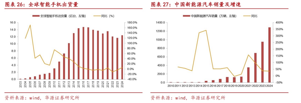 具体来看,碳酸锂的需求经历了由传统工业需求——消费电子需求——新能源需求增长驱动的转变。 2000 年前,碳酸锂的主要需求是传统工业需求,主要作为添加剂应用于陶瓷玻璃等。 2015 年前,碳酸锂的需求主要依靠消费电子驱动,碳酸锂用于锂电池正极材料钴酸锂。 2015 年后,碳酸锂的需求主要依靠新能源汽车拉动,2015-2024 年中国新能源汽车销量复合增速达 50%, 新能源需求将锂盐的需求提升到百万吨级别,从小金属跃升至大金属。