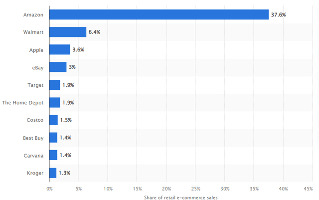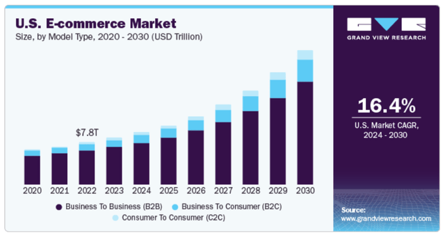 亚马逊在电商和云计算领域持续保持绝对领先地位。根据Grand View Research的数据,其美国电商市场份额高达37.6%,这一优势在规模超8万亿美元且年复合增长率达16.4%(至2030年)的市场中价值巨大。