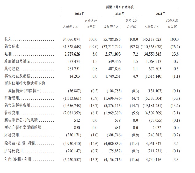 业绩方面,招股书显示,赛力斯的收入由2023年的人民币358亿元增加至2024年的人民币1451亿元,同比增长305.5%;2024年,赛力斯实现盈利。根据弗若斯特沙利文报告,公司是全球第四家实现盈利的新能源车企。2023年,赛力斯录得归母净亏损人民币24亿元;而到2024年,则录得归母净利润人民币59亿元。