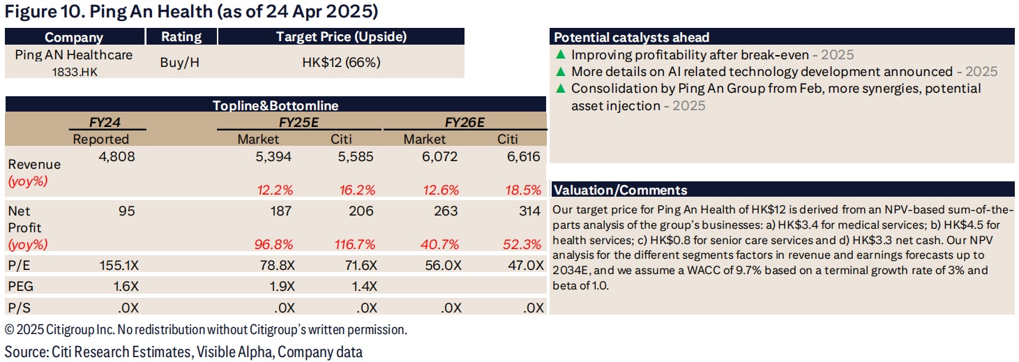 因此,花旗对平安健康给予12港元的目标价,是基于对集团各项业务进行净现值(NPV)加总分析得出的:a) 医疗服务业务3.4港元;b) 健康服务业务4.5港元;c) 养老服务业务0.8港元;以及d) 净现金3.3港元。 对不同业务板块的净现值分析,考虑了截至2034年的收入和盈利预测,并且该行假设加权平均资本成本(WACC)为9.7%,基于3%的永续增长率和1.0的贝塔系数。