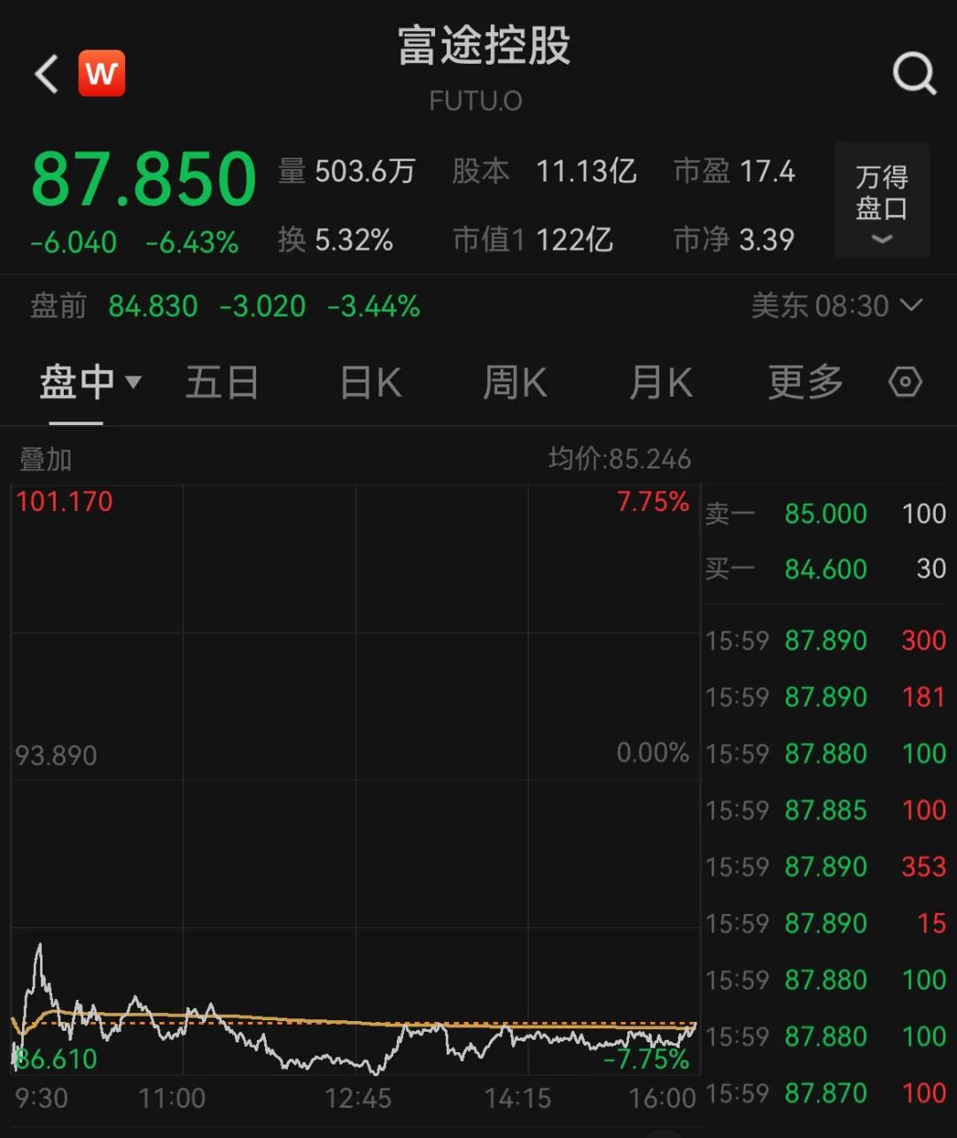 同一天,腾讯控股旗下富途控股(FUTU.US)下跌6.43%,报收87.85美元。